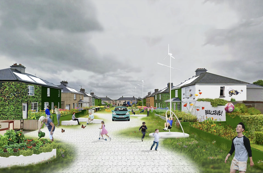 Kevin explained how his team developed a vision for their hometown of Ballina in the west of Ireland as a passion project. They created photo collages that showed the town’s neighbourhoods if they embraced the transition to sustainable living. This included weaving nature into the town’s streets and spaces. The vision was so compelling that it found support from elected officials and got adopted as a formal urban planning objective. Since then, they’ve worked with the town, local residents and other collaborators to deliver some of the initial ideas, including a rain garden and sensory garden.